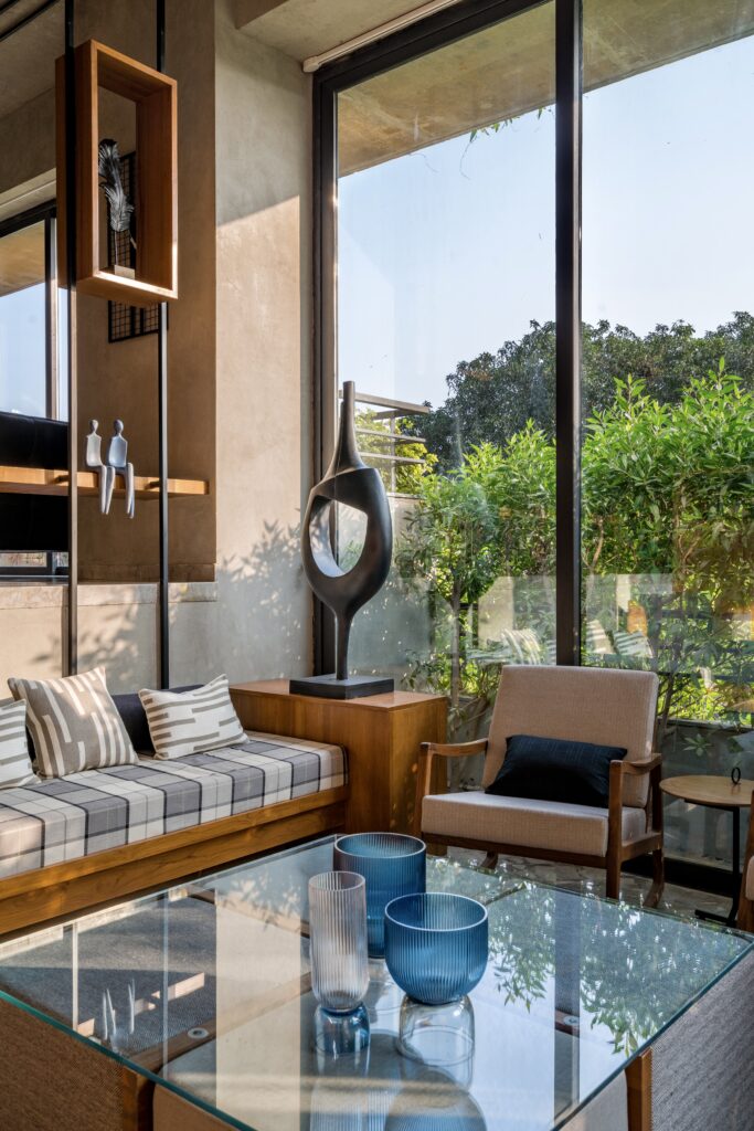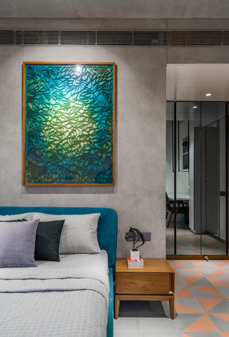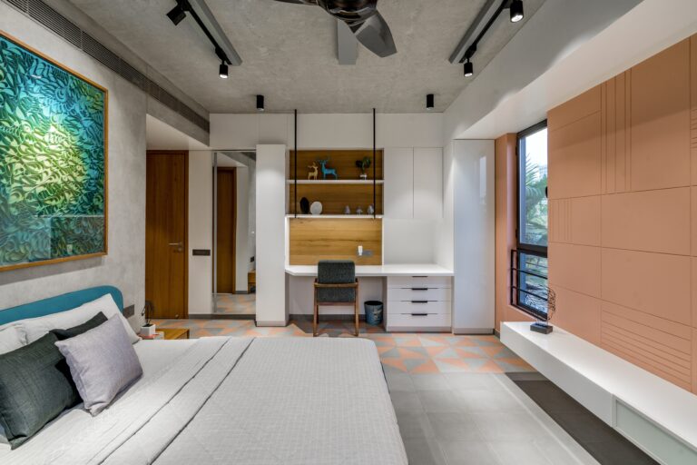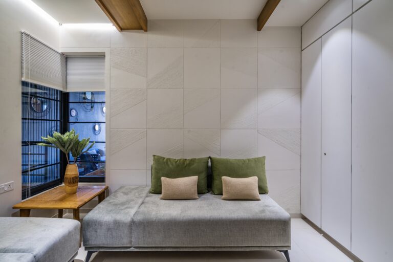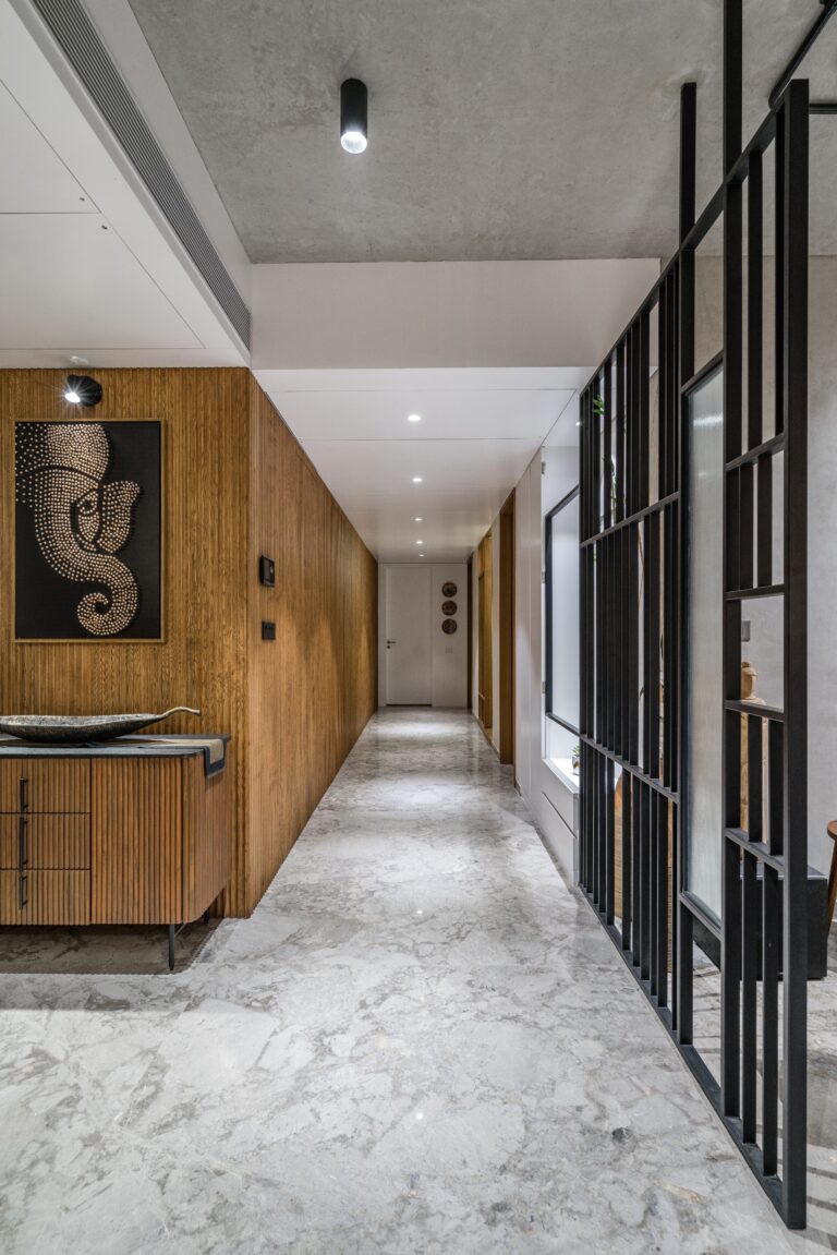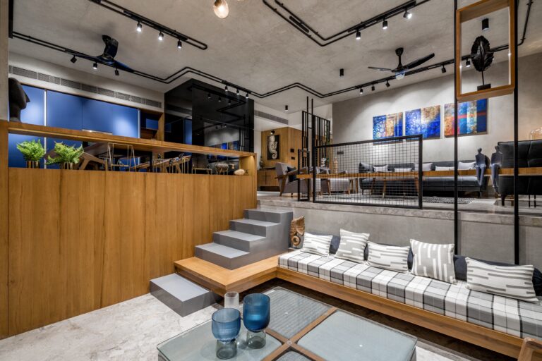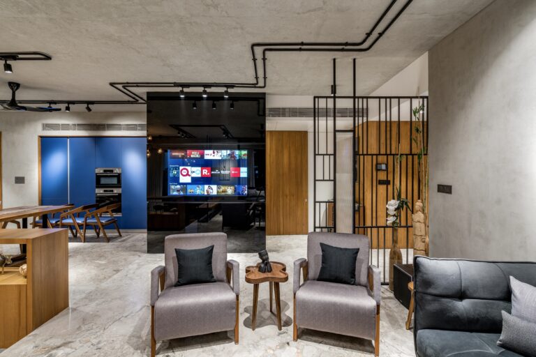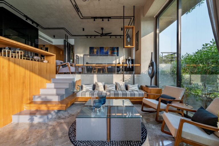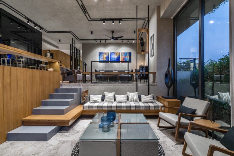 Located in one of Ahmedabad’s most sought-after residential complexes, this split-level apartment is part of a development known for its plantation-lined façades and spacious layouts. Designed for a young couple eager to move away from design stereotypes, the home reflects a bold yet balanced approach that synchronizes architecture with interiors.