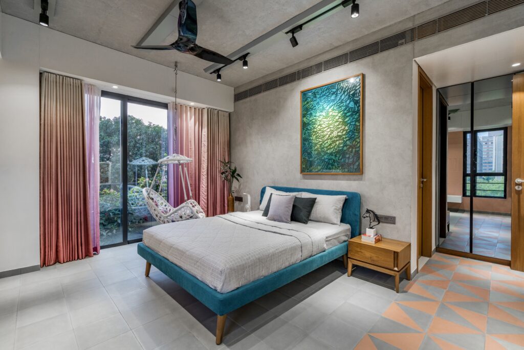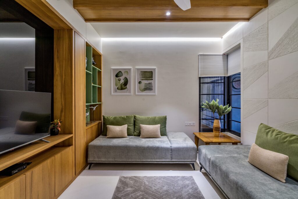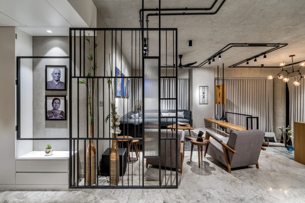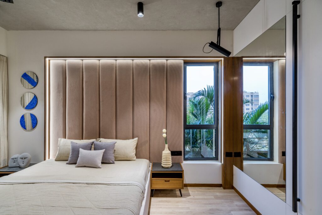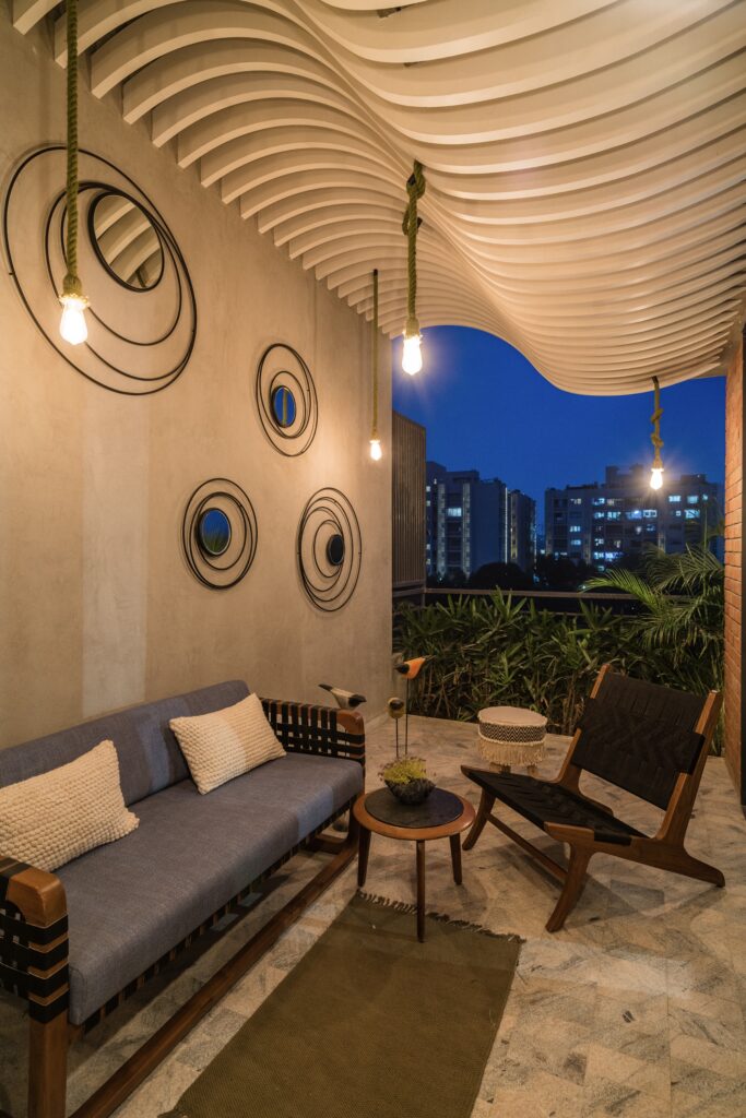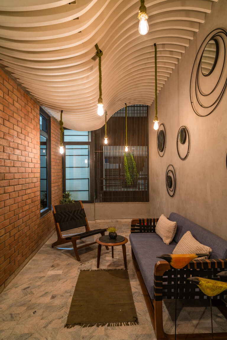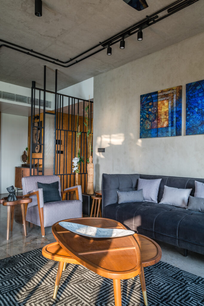 Located in one of Ahmedabad’s most sought-after residential complexes, this split-level apartment is part of a development known for its plantation-lined façades and spacious layouts. Designed for a young couple eager to move away from design stereotypes, the home reflects a bold yet balanced approach that synchronizes architecture with interiors.