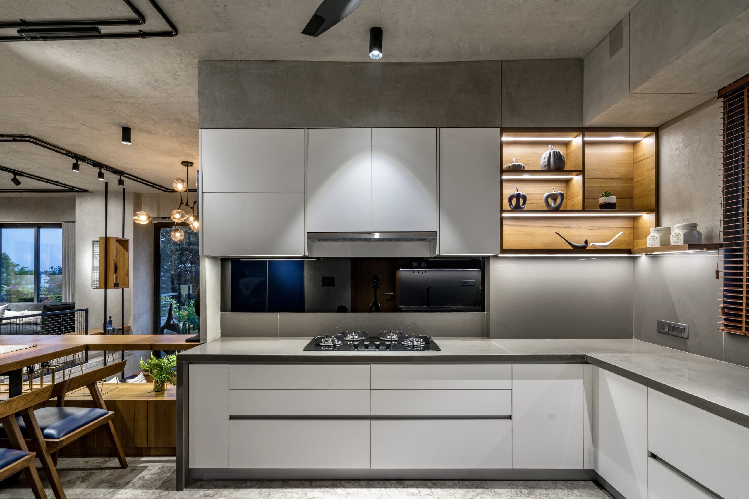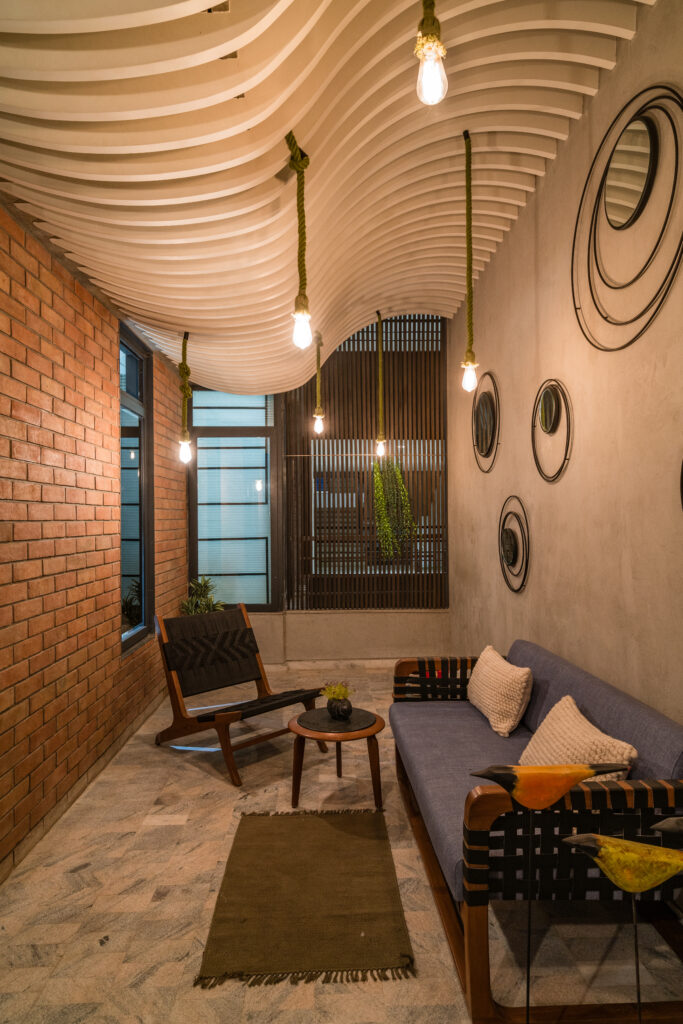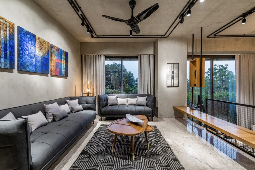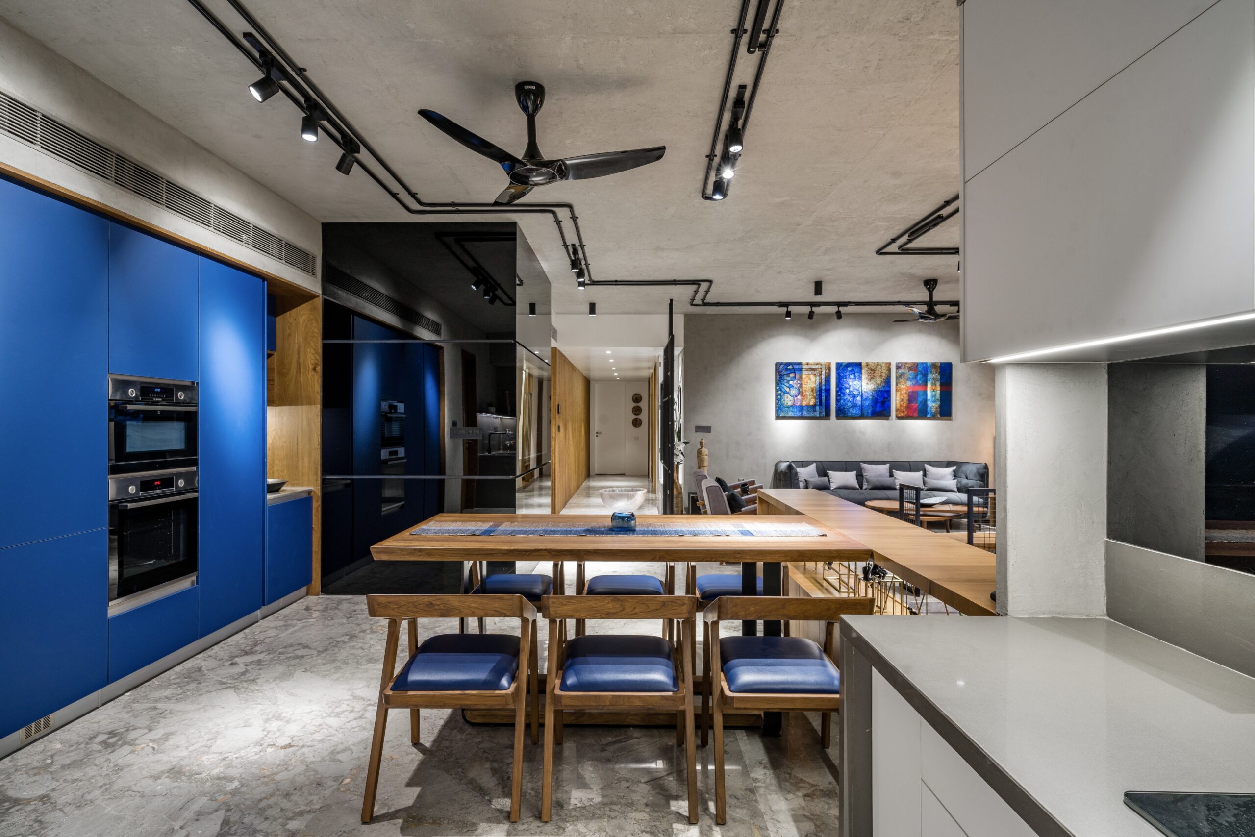 The interiors are an eclectic fusion of styles. Exposed concrete ceilings, faux-concrete walls, and open wiring establish a strong brutalist character, while vibrant blue color in paintings,artifacts and one kitchen cabinatory strike strongly in the interiors. These bold gestures are softened by eco-inspired choices such as natural finishes and earthy furniture, creating warmth and balance.